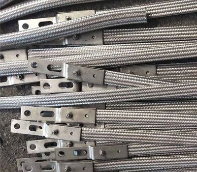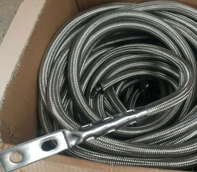铠装式柔性石墨接地引下线内部构造,带状,连接头连接牢靠,连接头宜采用螺栓锁紧式工艺和304不锈钢材质。石墨层内部需为厚度为1.25mm的镂空状304不锈钢带,石墨层外部为不锈钢丝编织层,不锈钢丝外部为黑黄相间的热缩管。规格型号应和配套的石墨基柔性接地体相同。